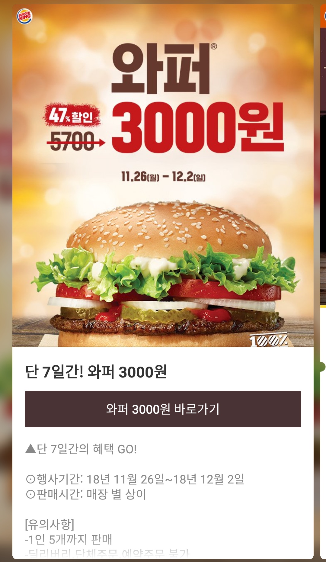 와퍼 3000원 들어왔다는 줄 알고 캐시백 행사있었던가 했네요
