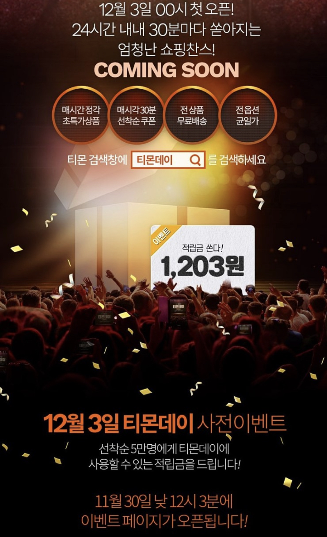12/3 티몬데이 사전 이벤트로 1203원 적립금을 5만명에게 쏜다고 합니다