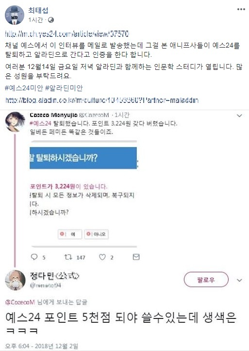 페미24와 최태섭한테 연락중인데 연락두절이라고 하고
