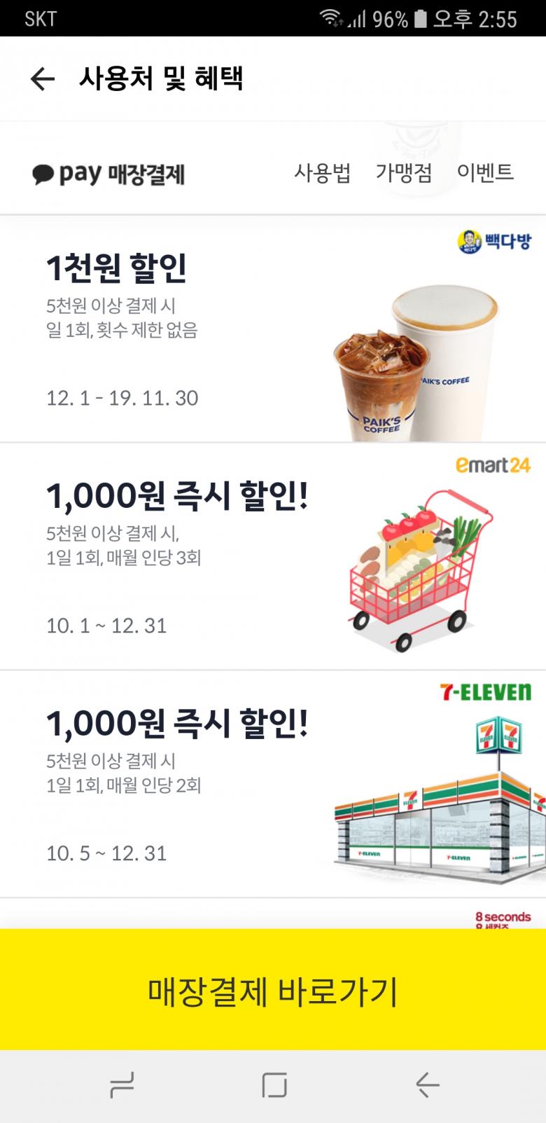 카카오페이 5000원 이상 결제시 이마트24 1000원 할인. 1일 1회. 월 3회