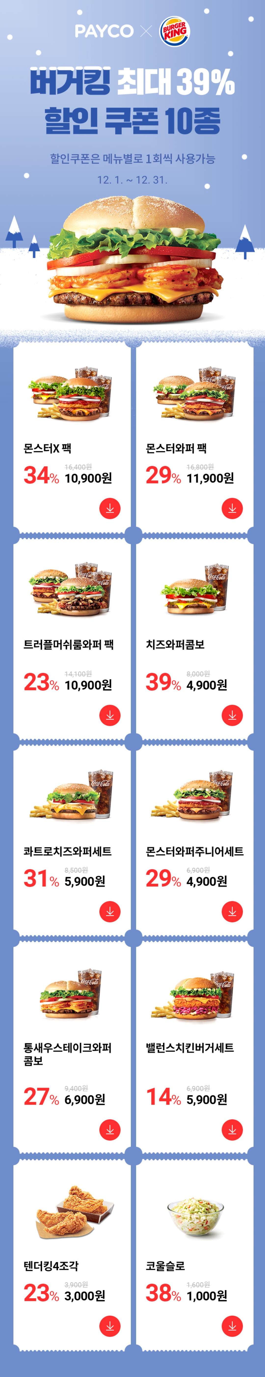 버거킹은 이제 쿠폰없이 가면 호갱님 느낌이 들 정도로 여기저기서 쿠폰을 남발하긴 하지만 페이코 쿠폰은 항상 다른데랑 좀 구성이 다릅니다. 할인율 높은 것 위주로 사용하면 되겠죠?