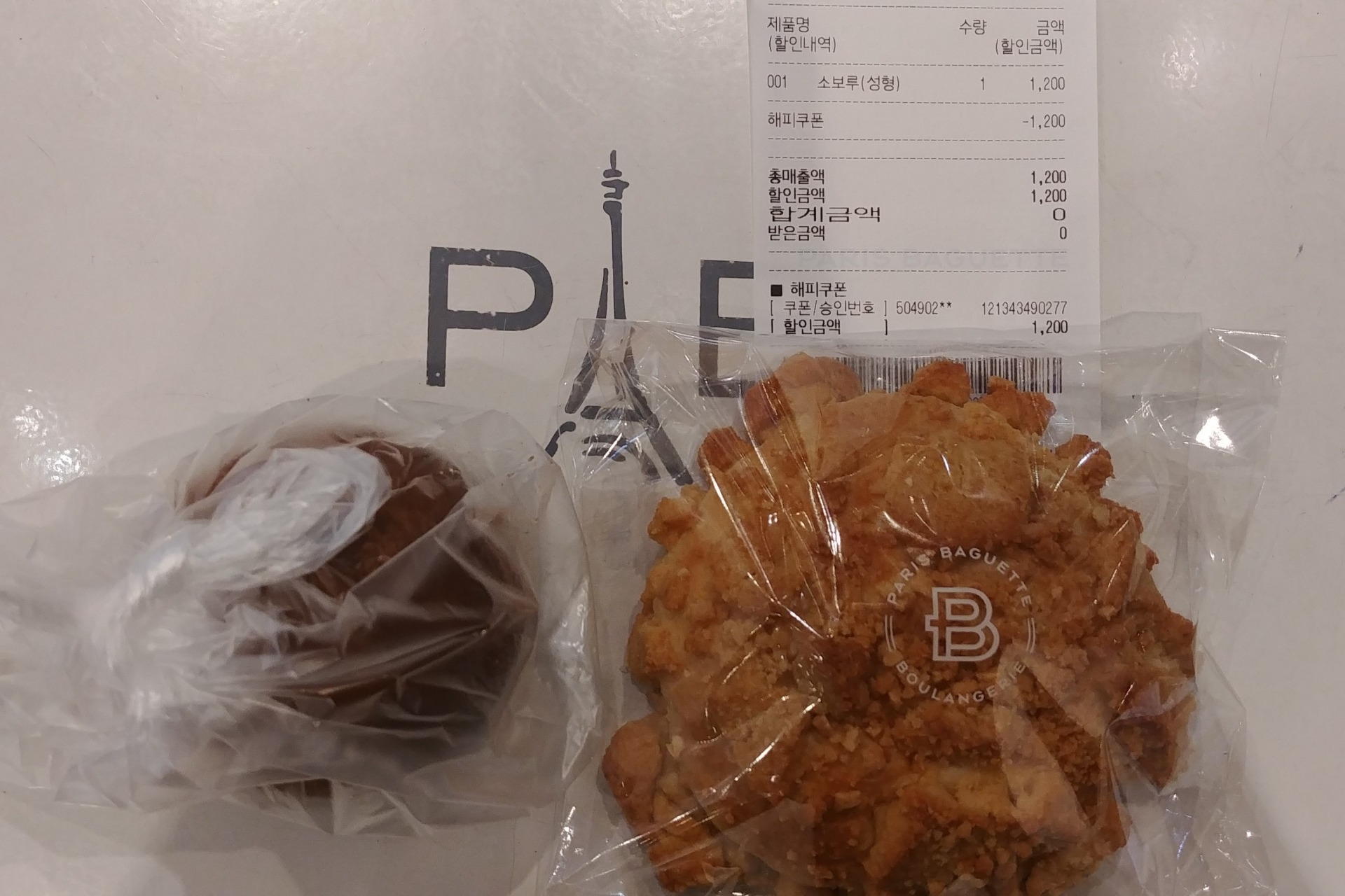 어떤 맛인지 넘 궁금했는데 아쉽지만 일단 같은 가격의 소보로빵을 골라 결제하고 온 김에 찹쌀도넛 하나 더 집었습니다 ㅋ
