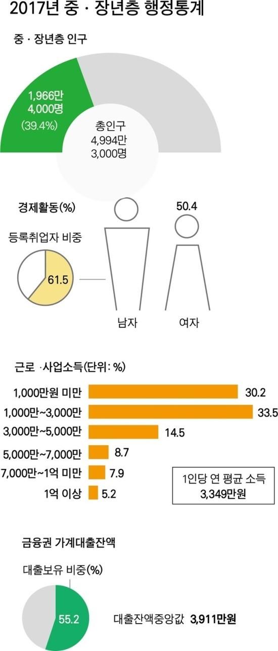 9. 중·장년(40~64세)도 힘들다 → 10명중 4명은 미취업, 소득 있어도 63.7%가 연소득 3000만원 미만. 남녀 성비은 50.2% 대 49.8%. ‘2017년 중,장년층 행정통계’. 중장년 대상 특화 통계는 이번이 처음.(한국 외)▼