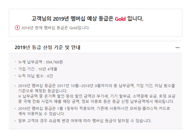 나름 비싼 요금제 쓰고 있다고 생각했는데 등급산정 납부금액에 빠지는게 많아서 그런지 기준에 미달했네요.