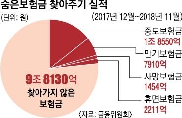 10. 잠자는 보험금 10조 → 지난해 보험 통합 조회 시스템 ‘내 보험 칮아줌’ 서비스 후 3조 넘게 찾아 갔지만 아직도 9조 8000억 남아 있어.(서울)▼
