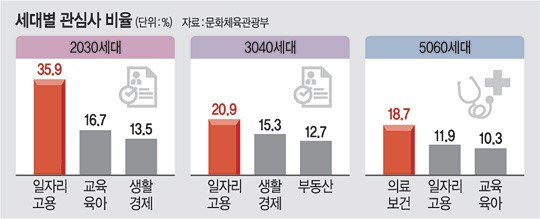 2. 한국인의 가장 큰 관심사는 ‘일자리’? → 문체부 ‘빅데이터’ 분석. 2030(36%), 3040(21%)모두 일자리를 1위 관심사로 꼽아. 5060은 의료보건(18.9%)에 이어 2위. 11.9%.(문화)▼