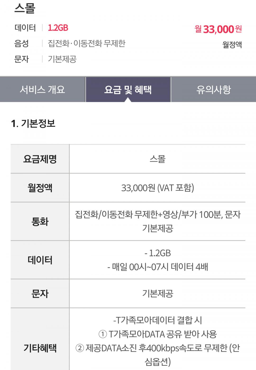 스몰은 가족중 패밀리 이상 요금을 아무도 안 써도 가입이 가능합니다.