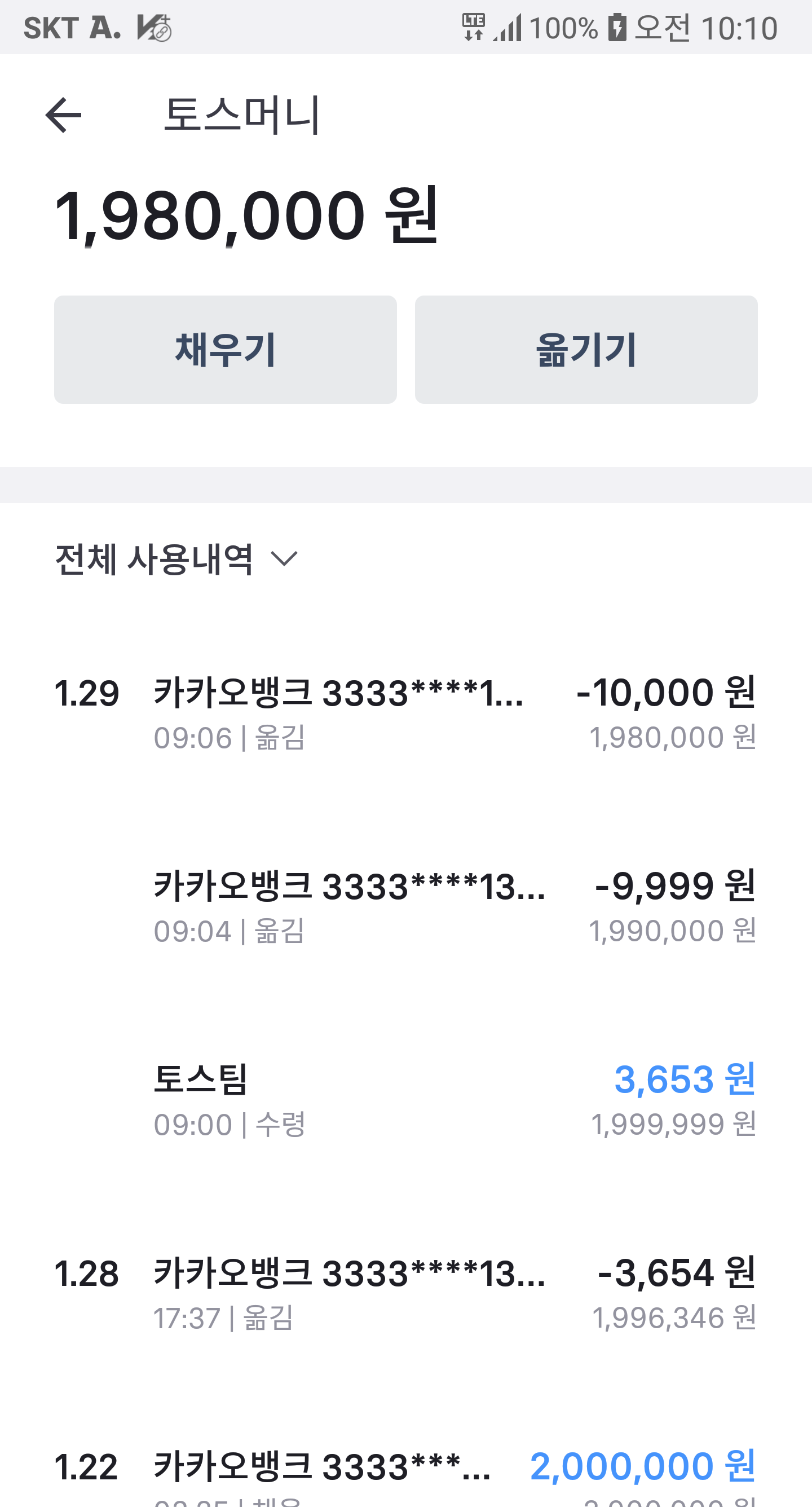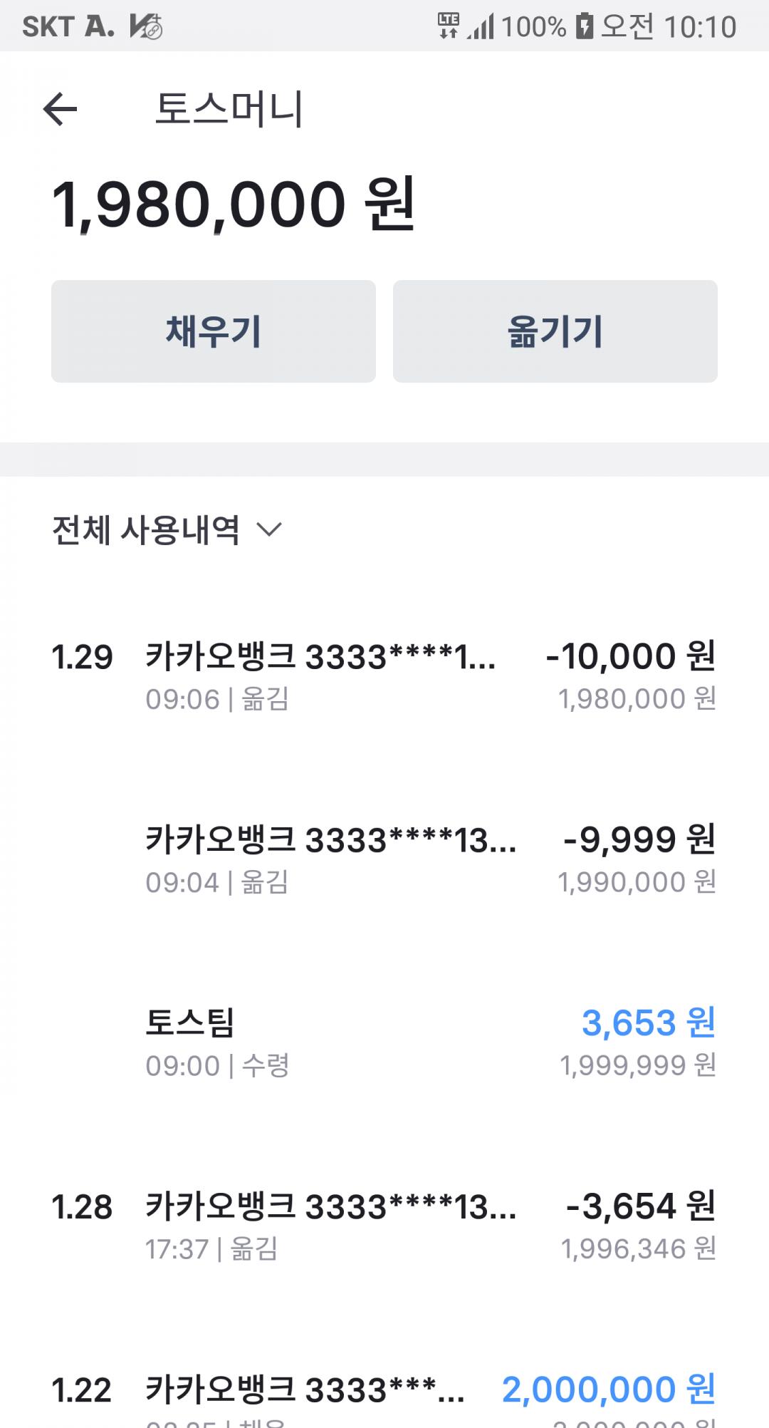200만원 채우려고보니 1만원 이상만 채우기 가능하대서 다시 9,999원 빼고서 채우기시도하니 안됨.