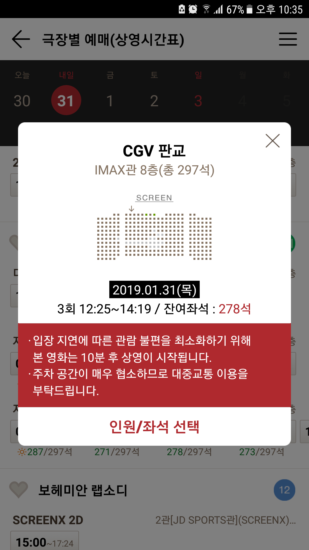 작은 관은 양쪽 통로가 있고 앞뒤 간격이 넓어진 곳이 많아서 가운데 통로가 별로 필요 없어요. 영화보며 화장실 안가는 편이라 불편함은 못느껴봤네요. |