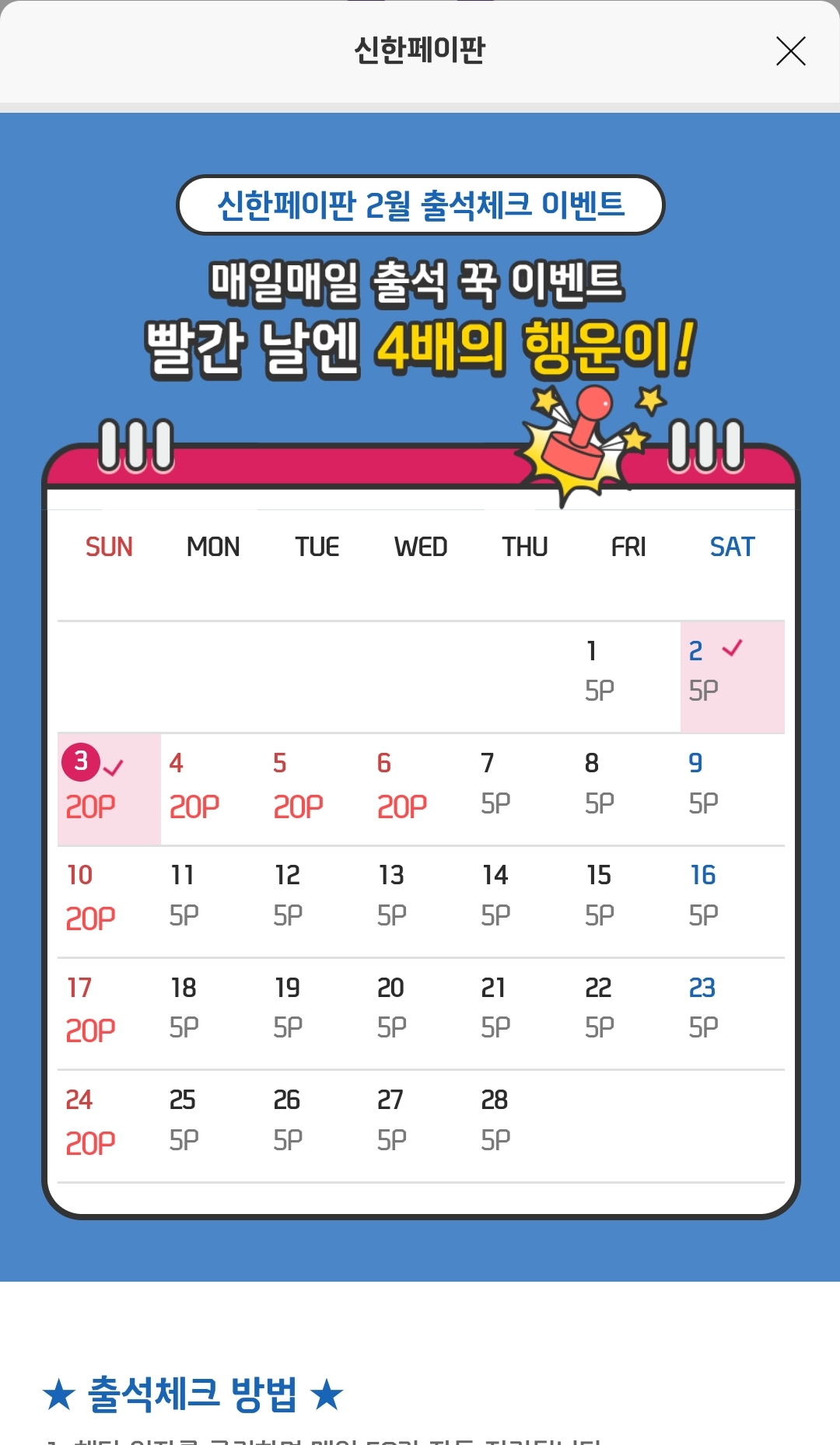 매일 5포인트씩 받을 수 있고 매주 일요일과 설 연휴 동안에는 20포인트씩 주네요.