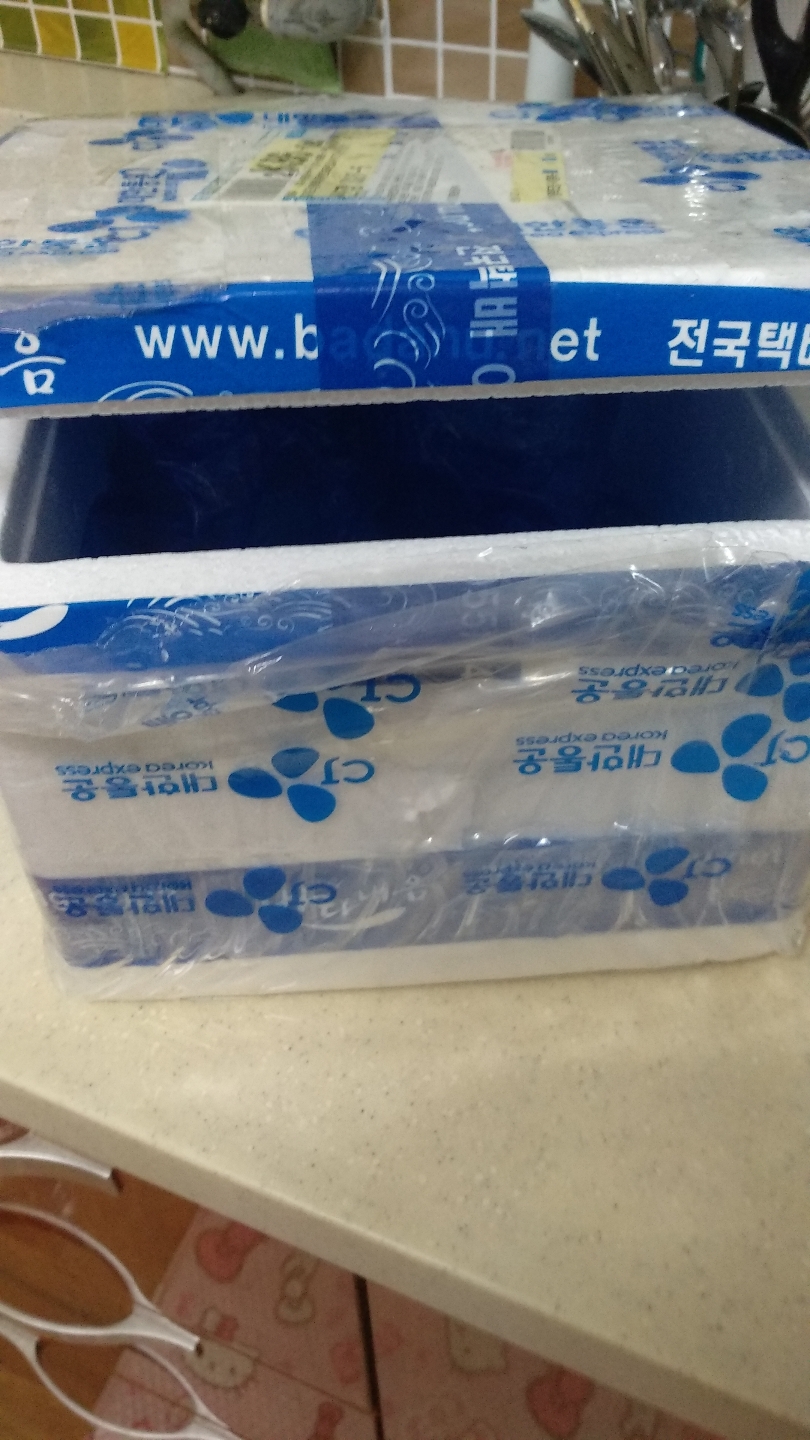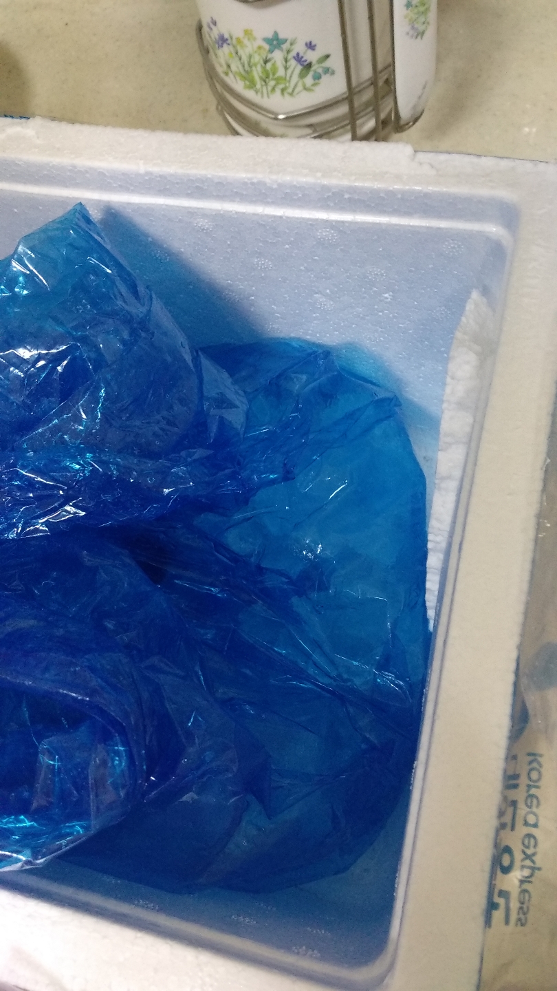 1. 아이스박스 파손 되어 있는 것을 테이프 두르고 비닐에 넣어 배송 아이스 박스에 넣은 얼음이 녹으며 물이 질질
