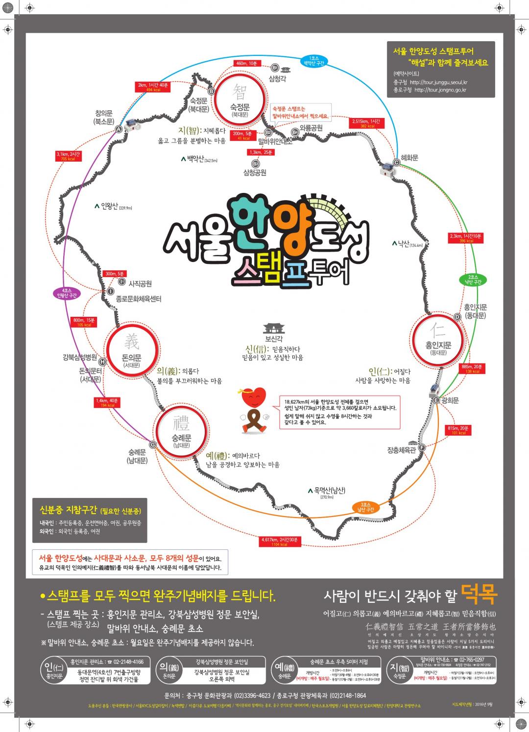 개인적으로 제일 힘든게 창의문->북악산. 사직공원->인왕산 방향입니다. 남산은 완만해서 그다지 안 힘들구요. 그리고 중간중간 낙산공원 ->혜화문 동대문->광희문->장충체육관등 갈때 골목길 지나가야하는데 처음가면 다소 헤맬있습니다. 남대문-> 정동길도 좀 헷갈릴수있는.... |