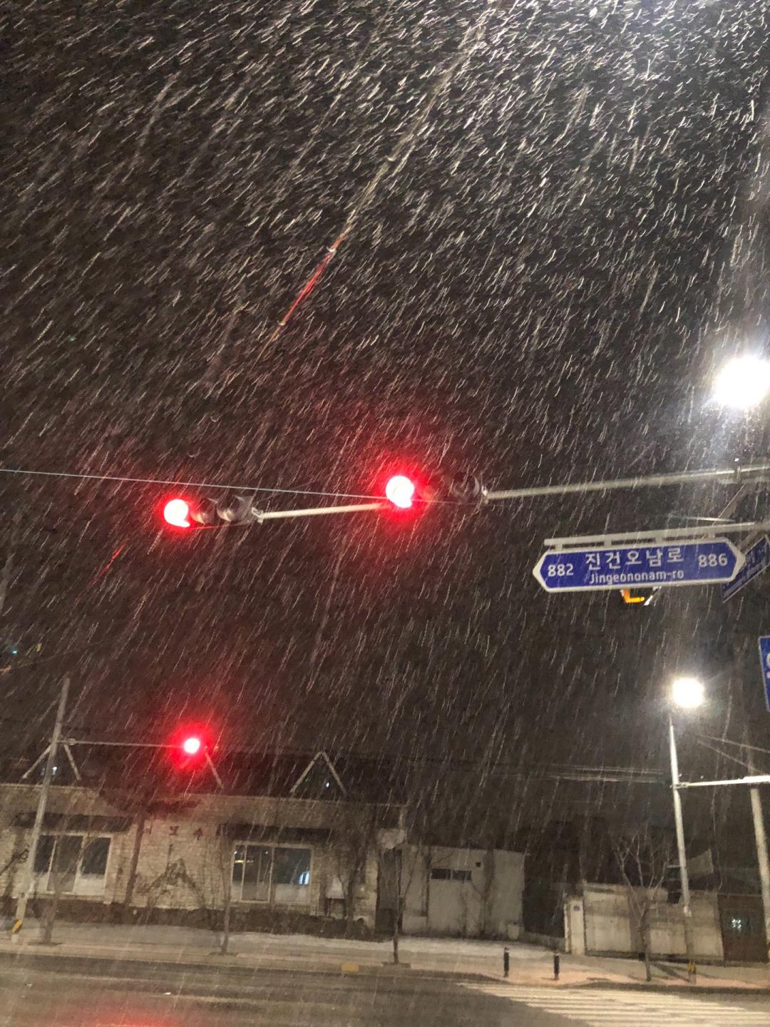 새벽에 고속도로로 오다보니 제설차가 눈보다 더 많은 제설제를 뿌리고 다니길래 쌓이지는 않겠다 싶었어요~