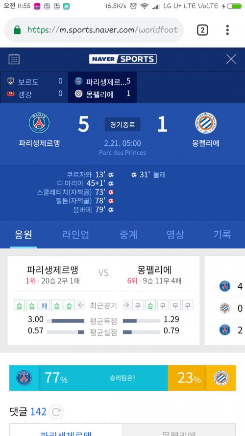 네이마르 카바니없어도 화력 강하네요..자책골도 어쨋듯 파리에서 만든거니까요.. | ||