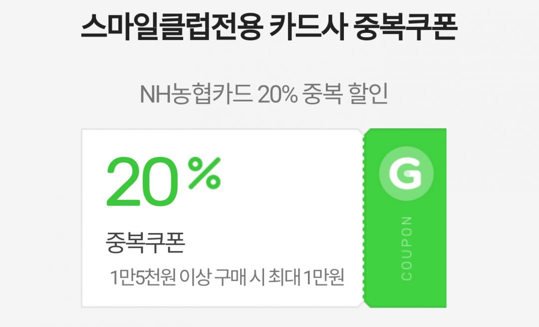 [스마일클럽] 농협카드 20% 중복쿠폰 (1만 5천 이상 최대 1만 할인)
