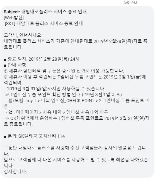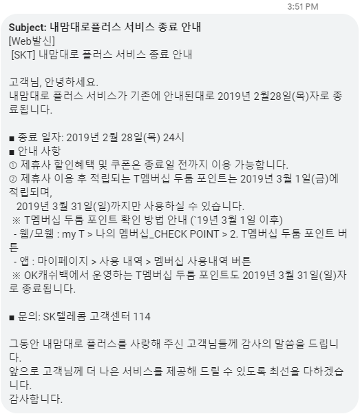뭔가 새로운 서비스를 론칭하는가 싶어서 기다려봤는데 그런거도 아니고 그냥 기존 서비스 종료를 한다는 내용만 잔뜩 적어서 문자로 통보를 하는군요..