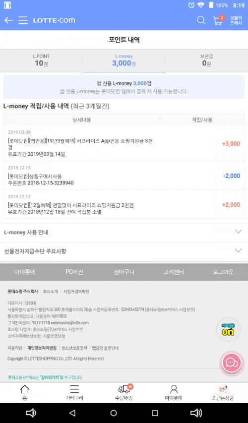 롯데는 적립금 넣어주면 문자가 옵니다.