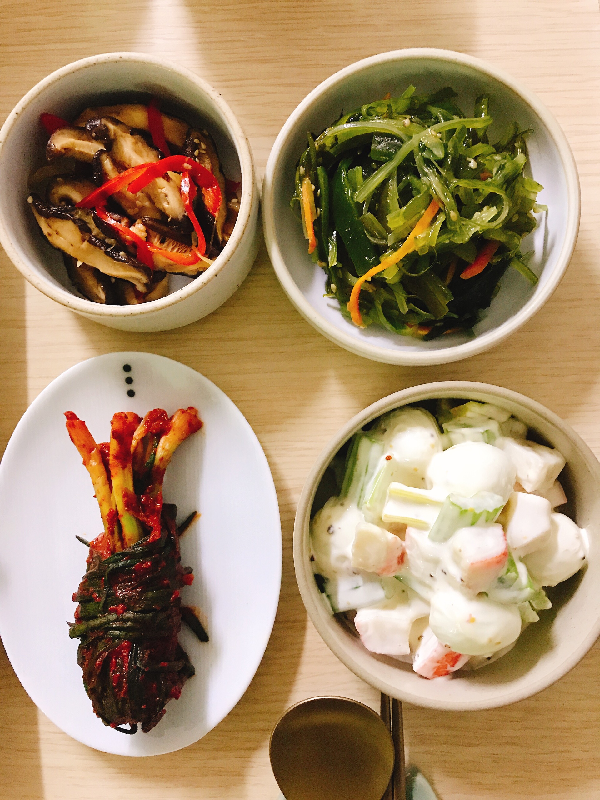 어제 만들어둔, 밑반찬이랑, 오늘 만든것 두가지 얹으니, 푸짐해졌어요.