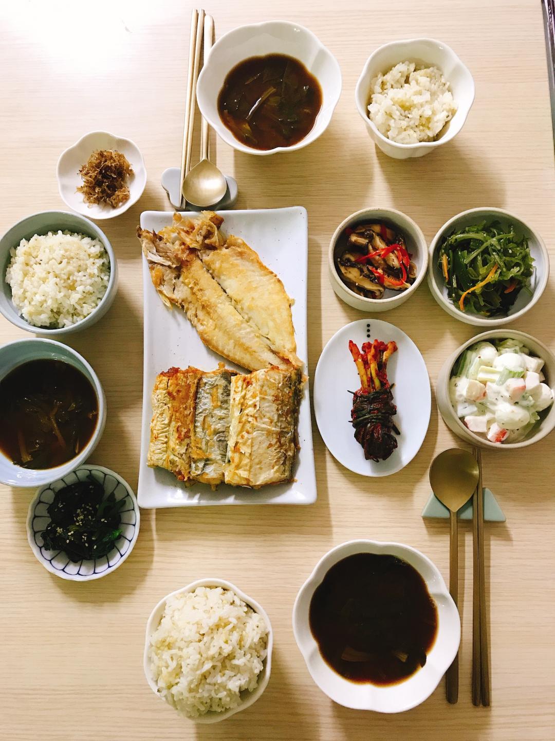 찰기장밥, 시금치국 과, 꼬마옥돔이랑 갈치 구웠어요.