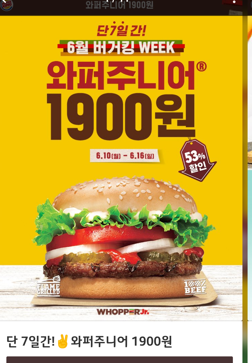 2개 같이 먹어야 배부른 와퍼주니어 1주일간 행사래요