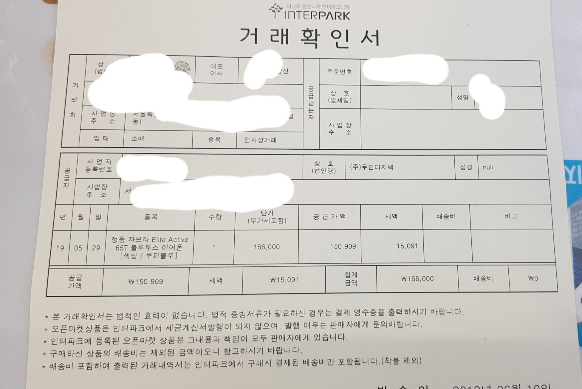 인터파크에서 이어폰 구매했는데요 영수증