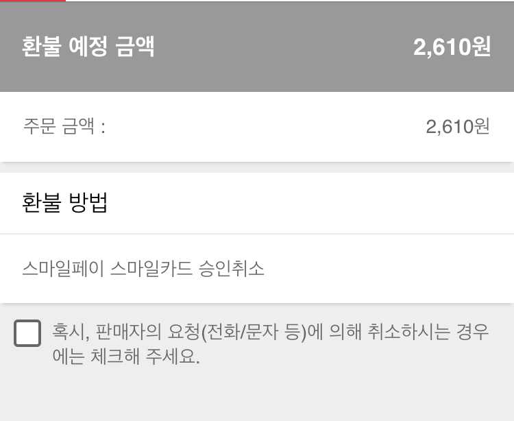 판매자 전화로 취소한거이긴 하나, 체크하면 판매자에게 불이익 갈 것 같아서 그냥 취소처리했어요.