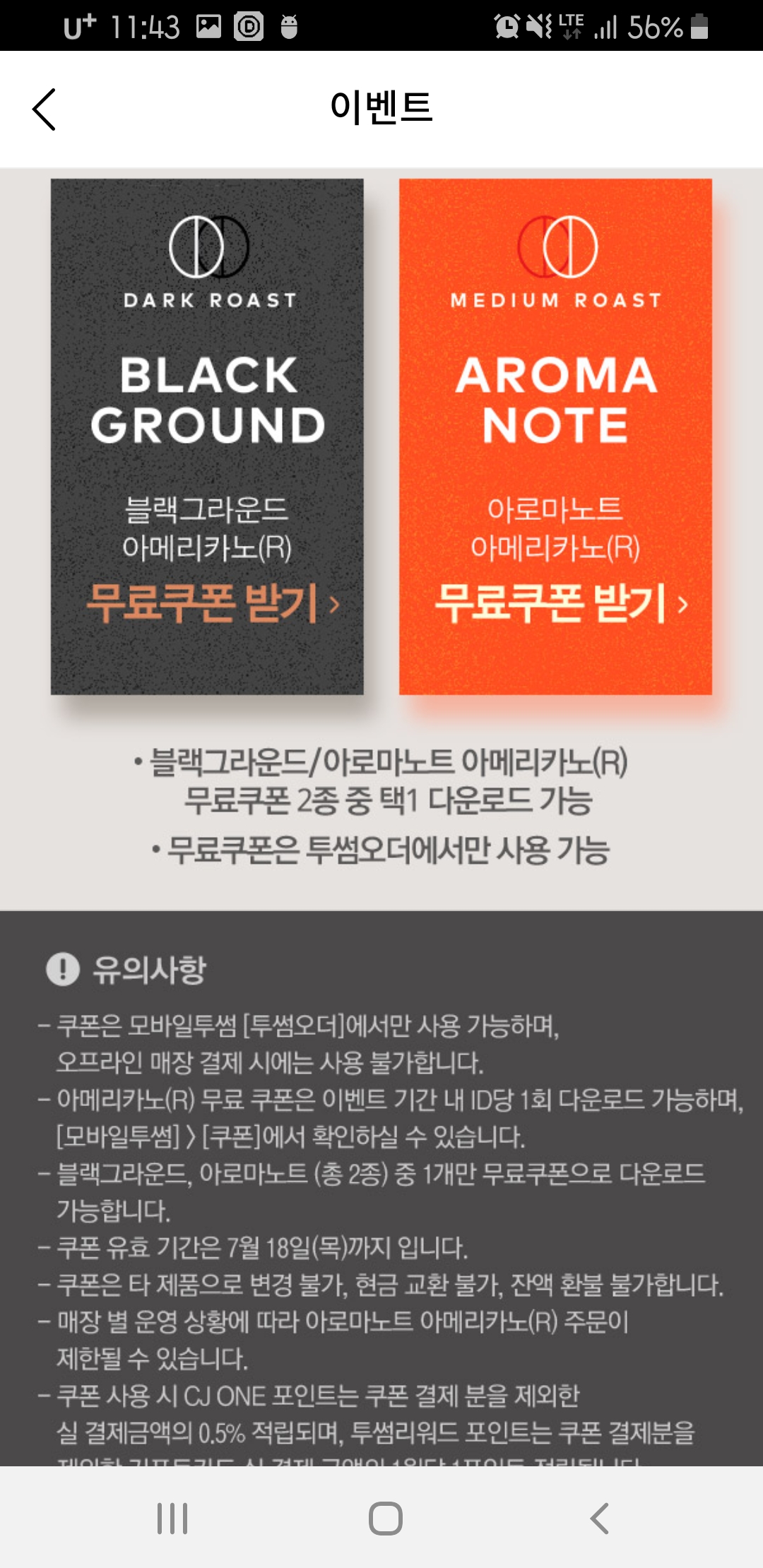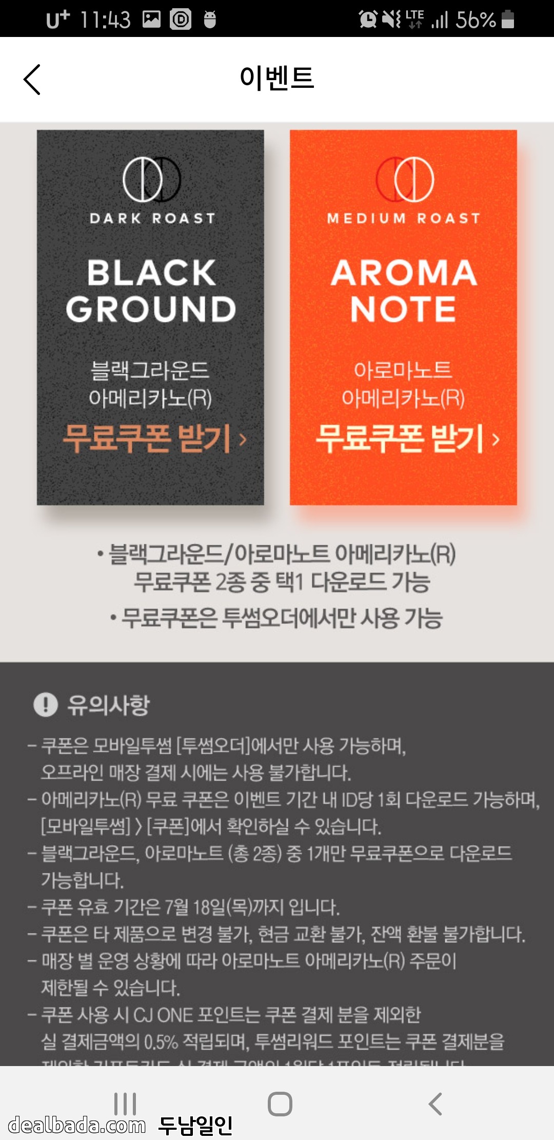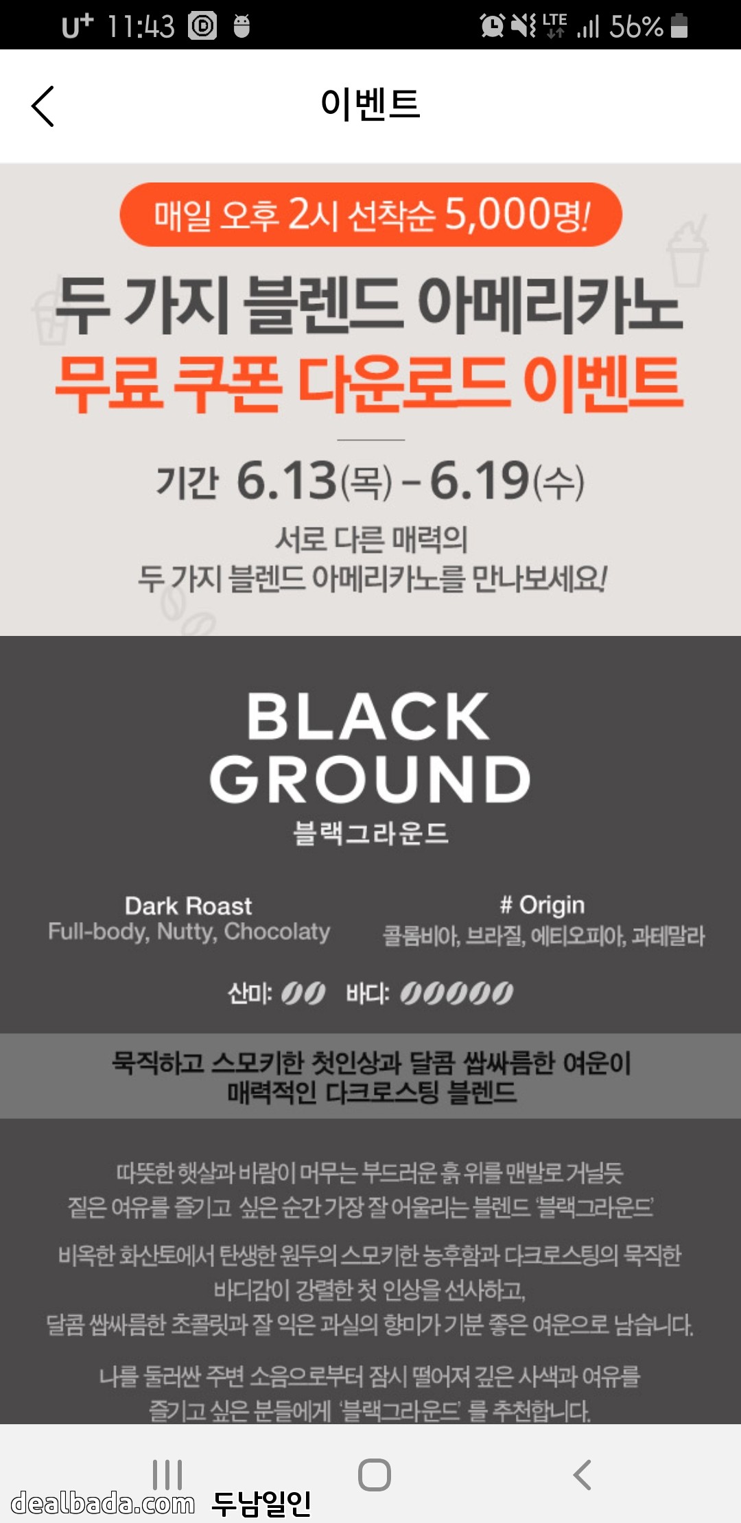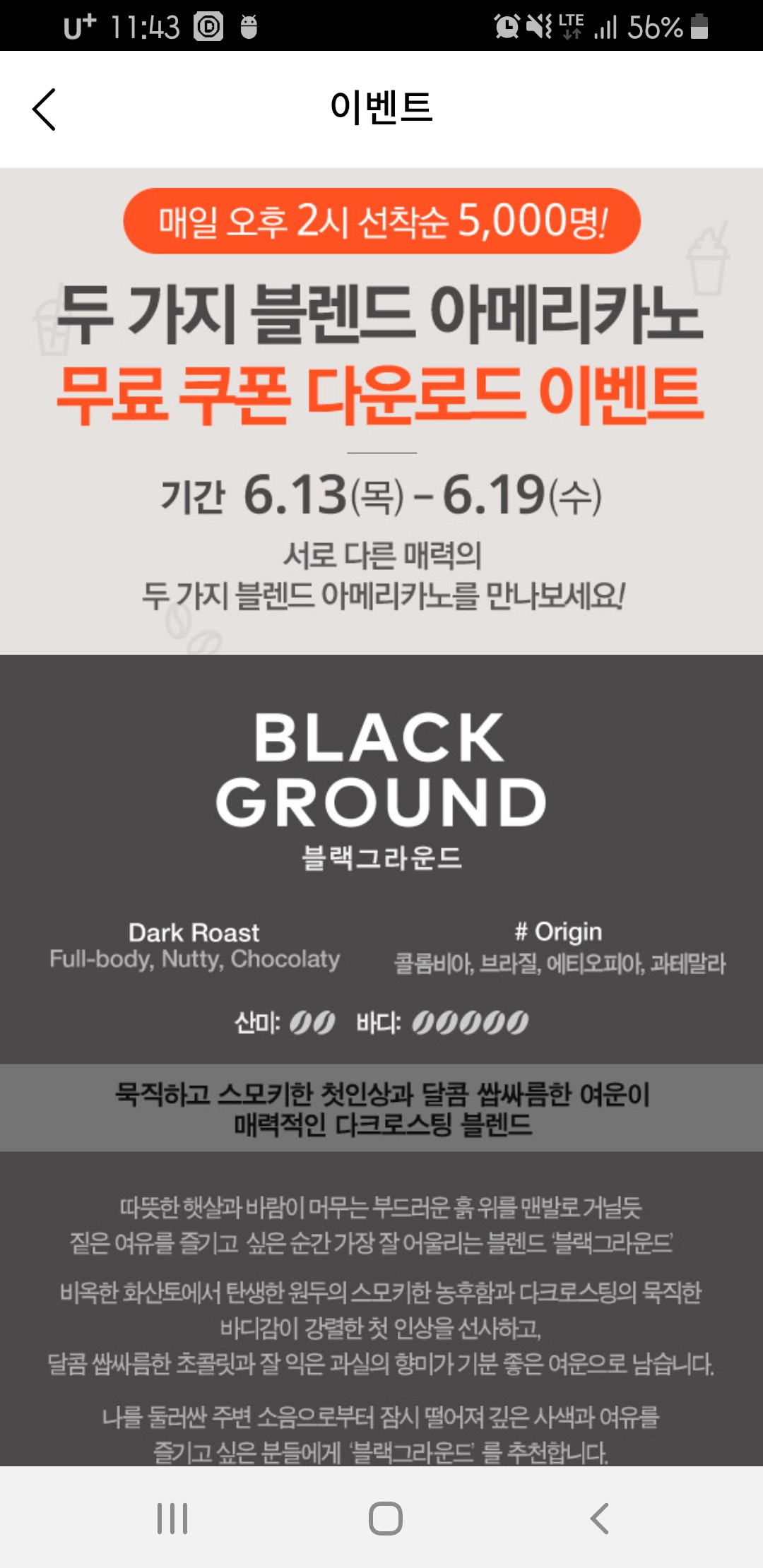 19일(수)까지 매일 오후2시 선착순 5,000명에게 아메리카노 무료쿠폰 주네요.ㅋ