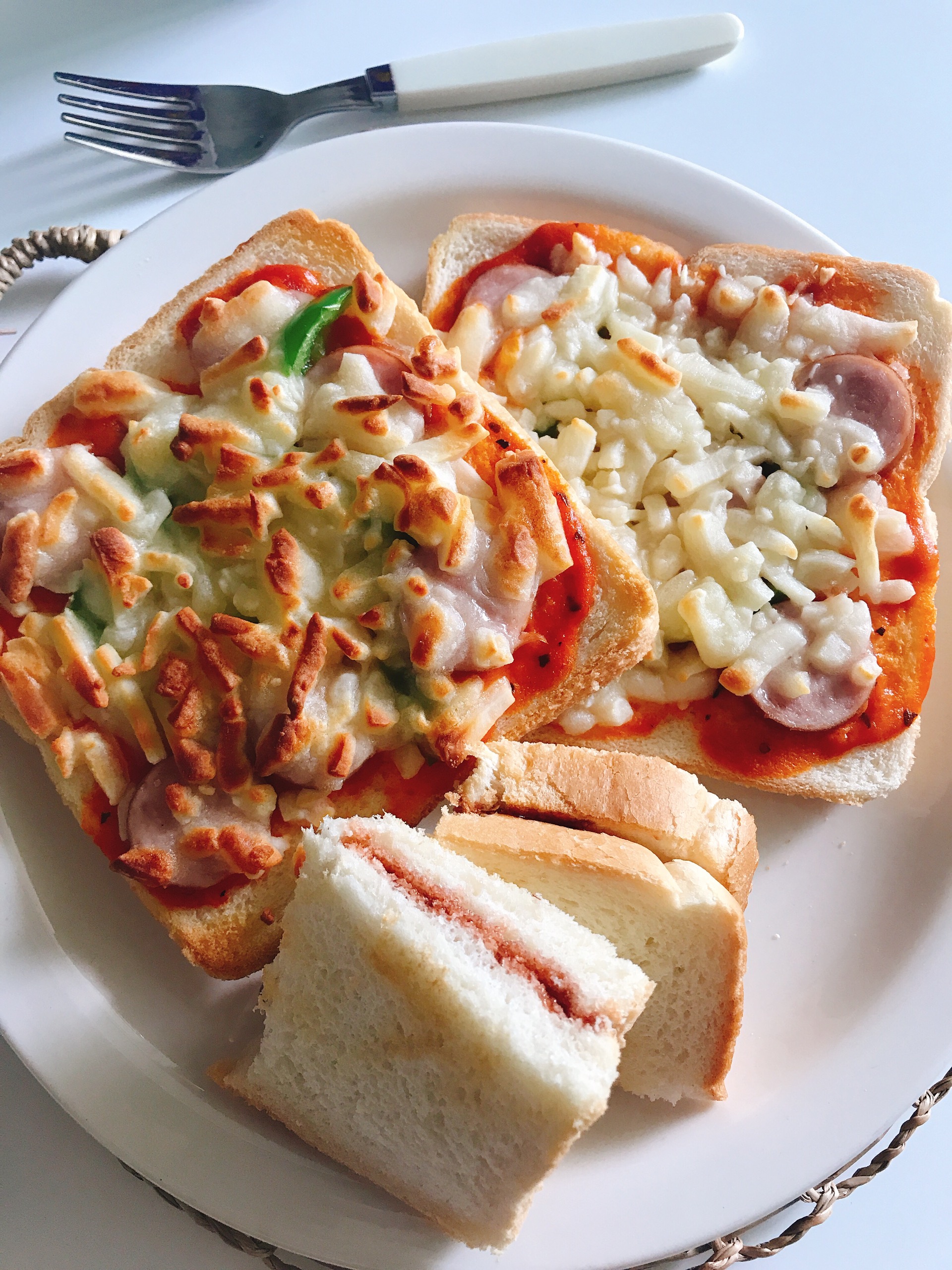 토스트빵에, 전에 가지요리 하고 남은, 로제소스 바르고, 피망 채썰어 올리고, 아이가 썬 소세지도 올리고, 치즈 듬뿍 올려서 굽기.