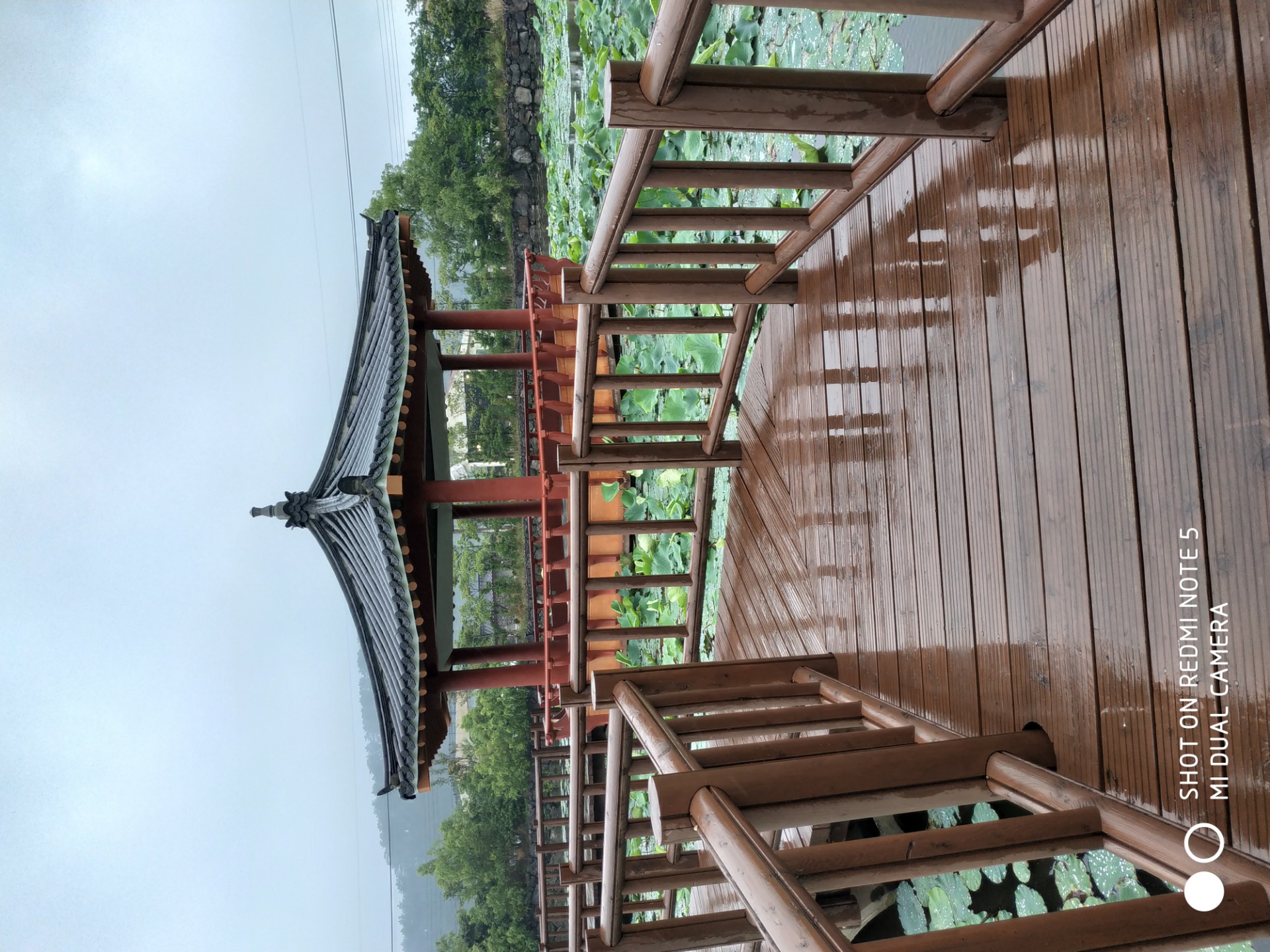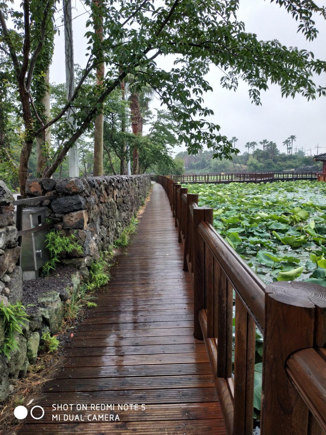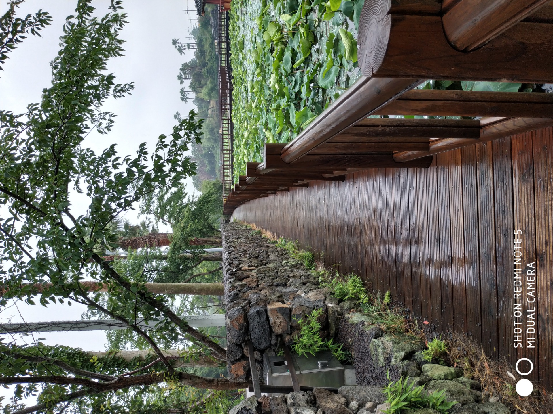 비온뒤 촉촉하게 젖은 연못,목조길 운치있네요