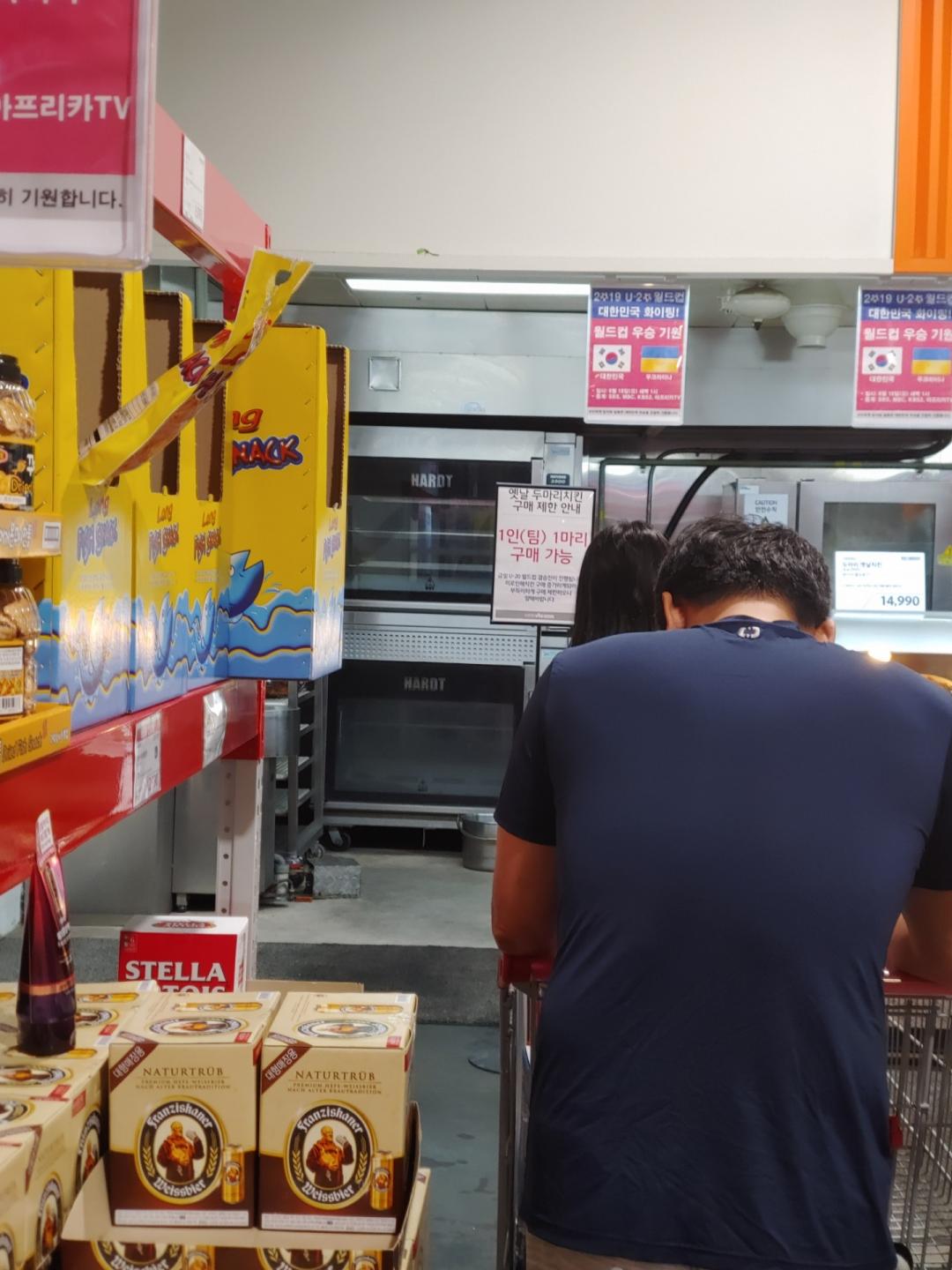 롯데빅마켓 왔는데 월드컵 결승전 덕에 치킨줄이 기네요 저도 기다리는중이에요 마누라는 쇼핑중이고