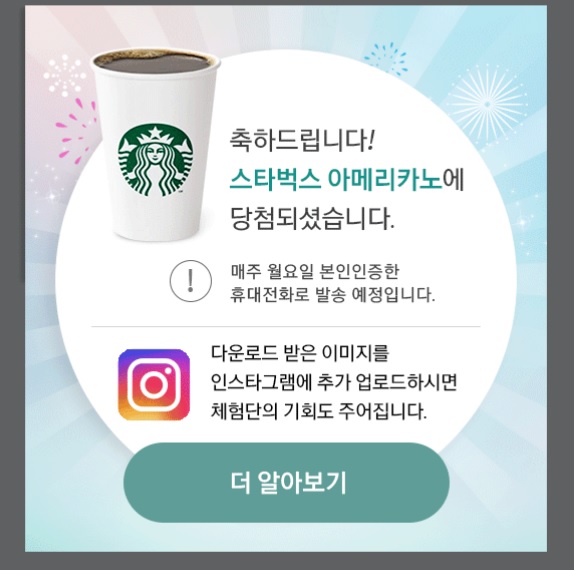 와 감사합니다ㅎㅎ 며칠째 실패였는데 당첨기운을 받았나봐요~ 스벅 당첨입니다!!! |
