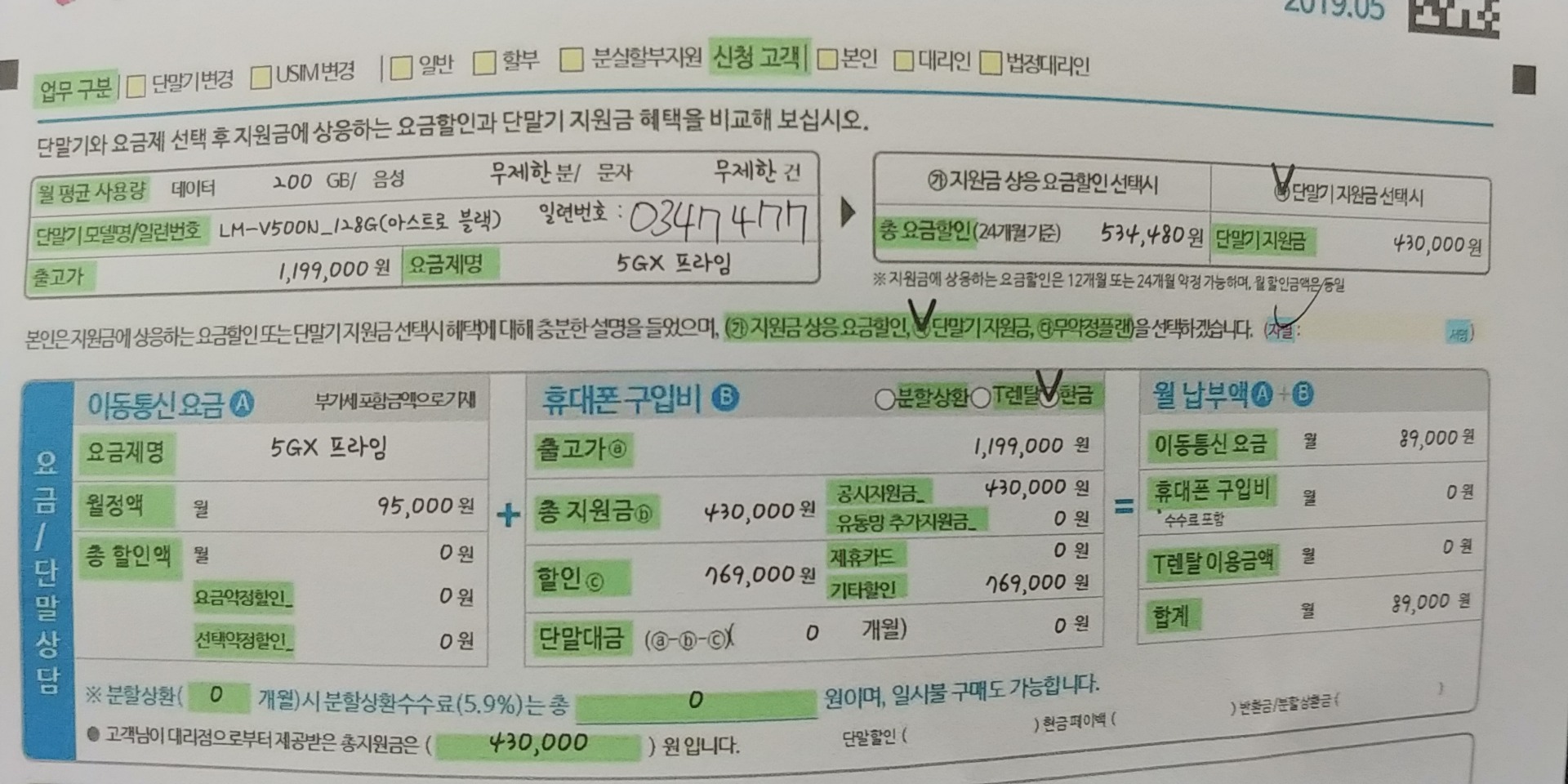 기변되었다는 문자받고 유심 빼서 끼우라고 알려주더군요. 할부원금 0원에 폰요금만 정확히 89000원입니다.