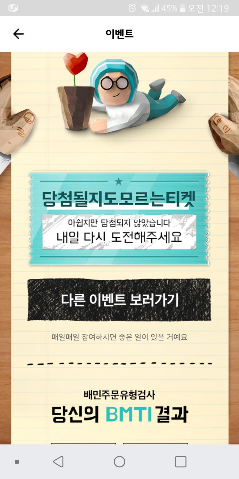 저시간에 메인배너에 안뜨길래 이벤트 끝난줄알았는데.. 숨어있네요; 아침에 했는데 또 꽝 ㅠ |