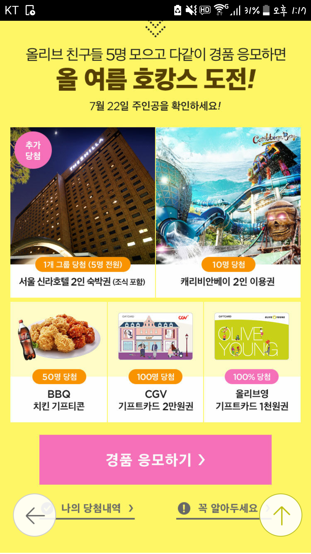 오픈카톡방 입장 후에 올리브영 앱 깔고 올리브영 공유링크통해 로그인하신 후에 5명 완료되면 경품 응모하기 누르시면 됩니다.