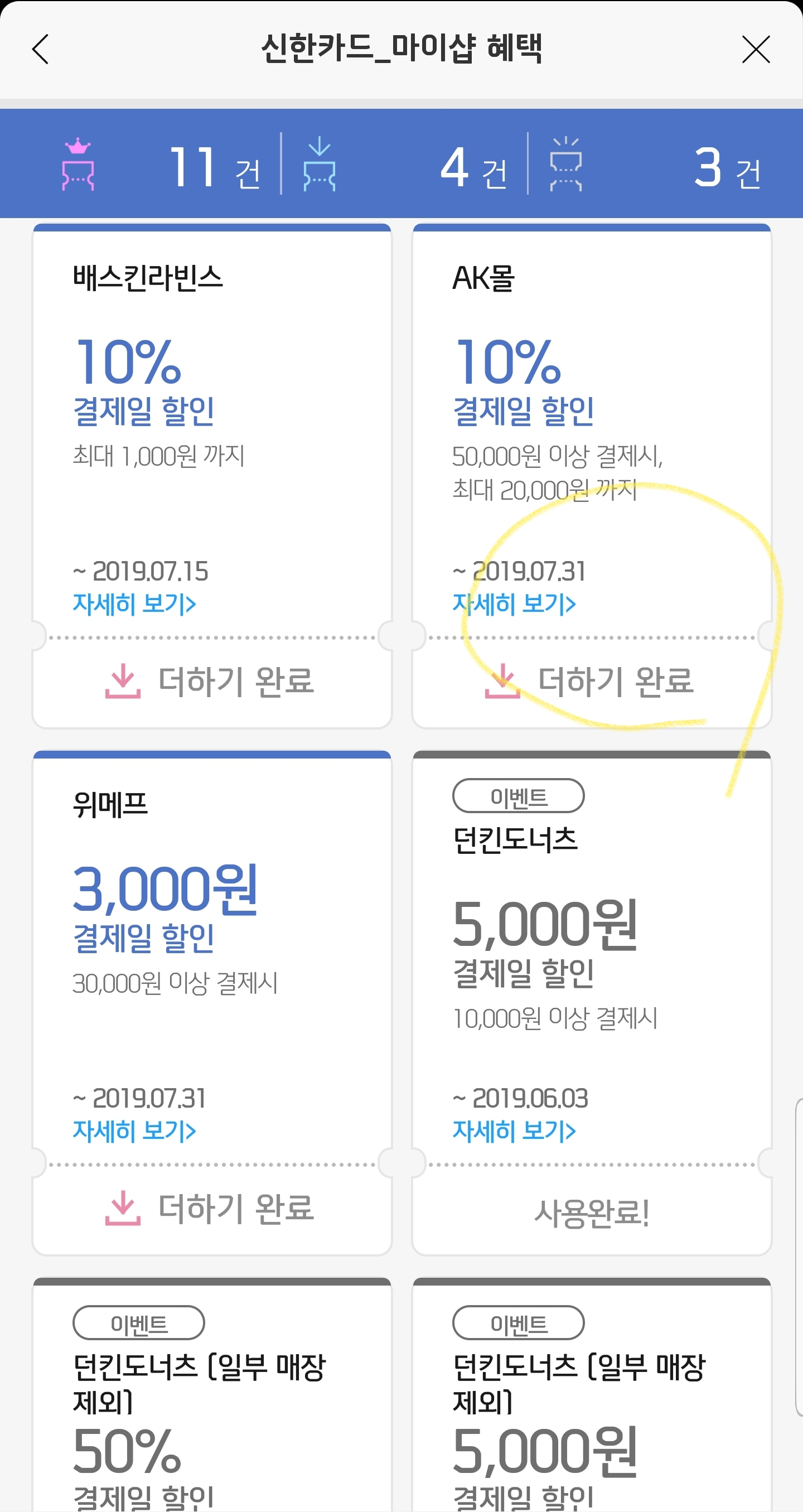 저는 신한카드 마이샵에 할인혜택이 없네요 |