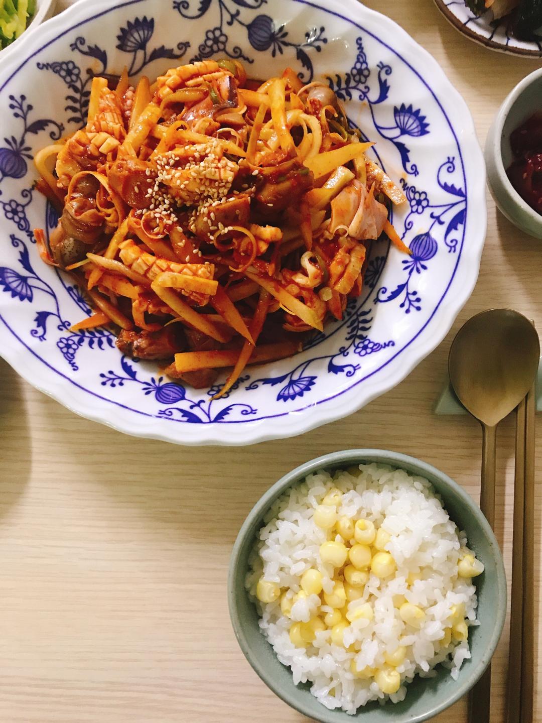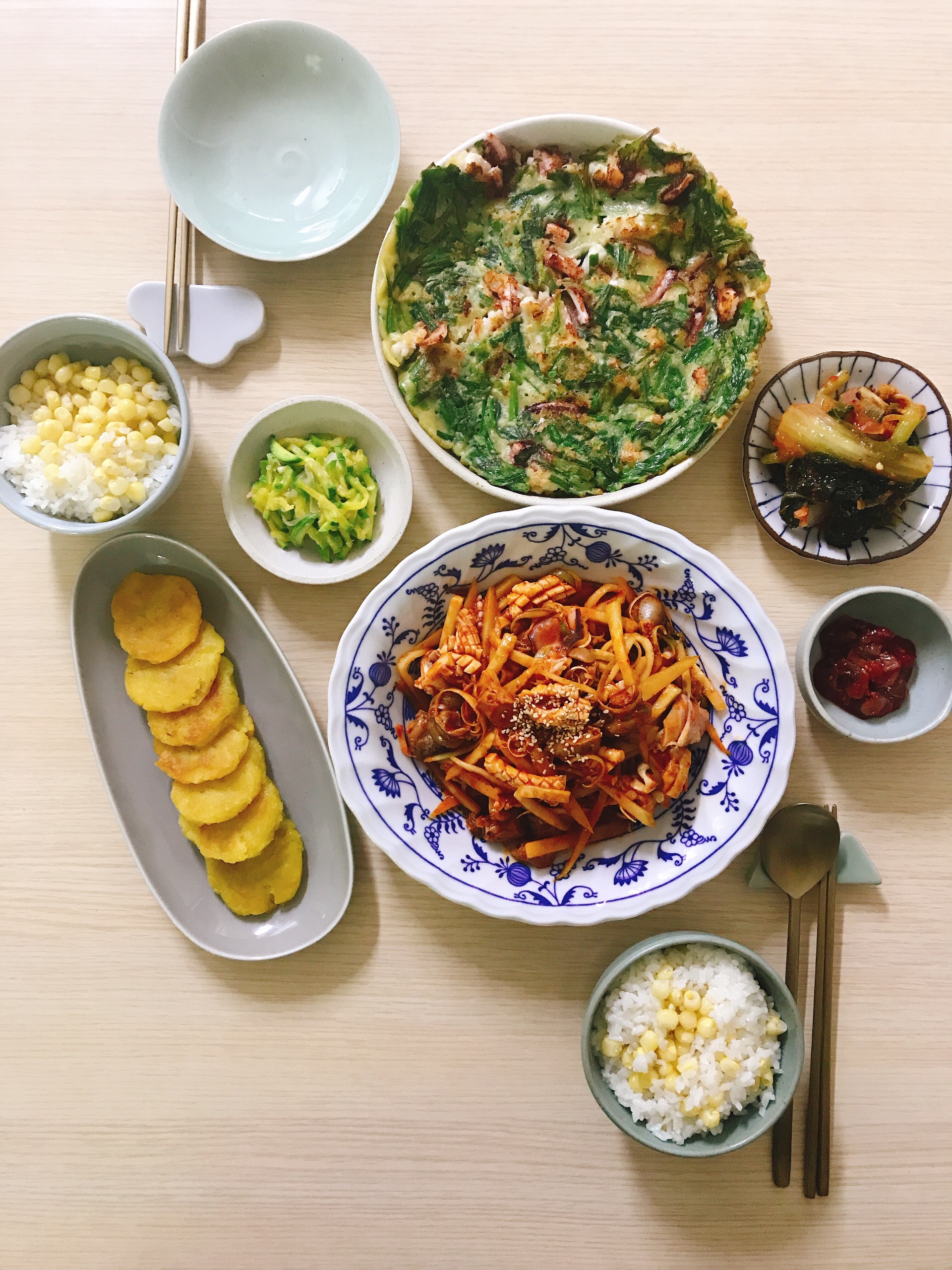 옥수수밥 과, 부추전 & 고구마전, 오징어골뱅이무침, 준비 했어요.