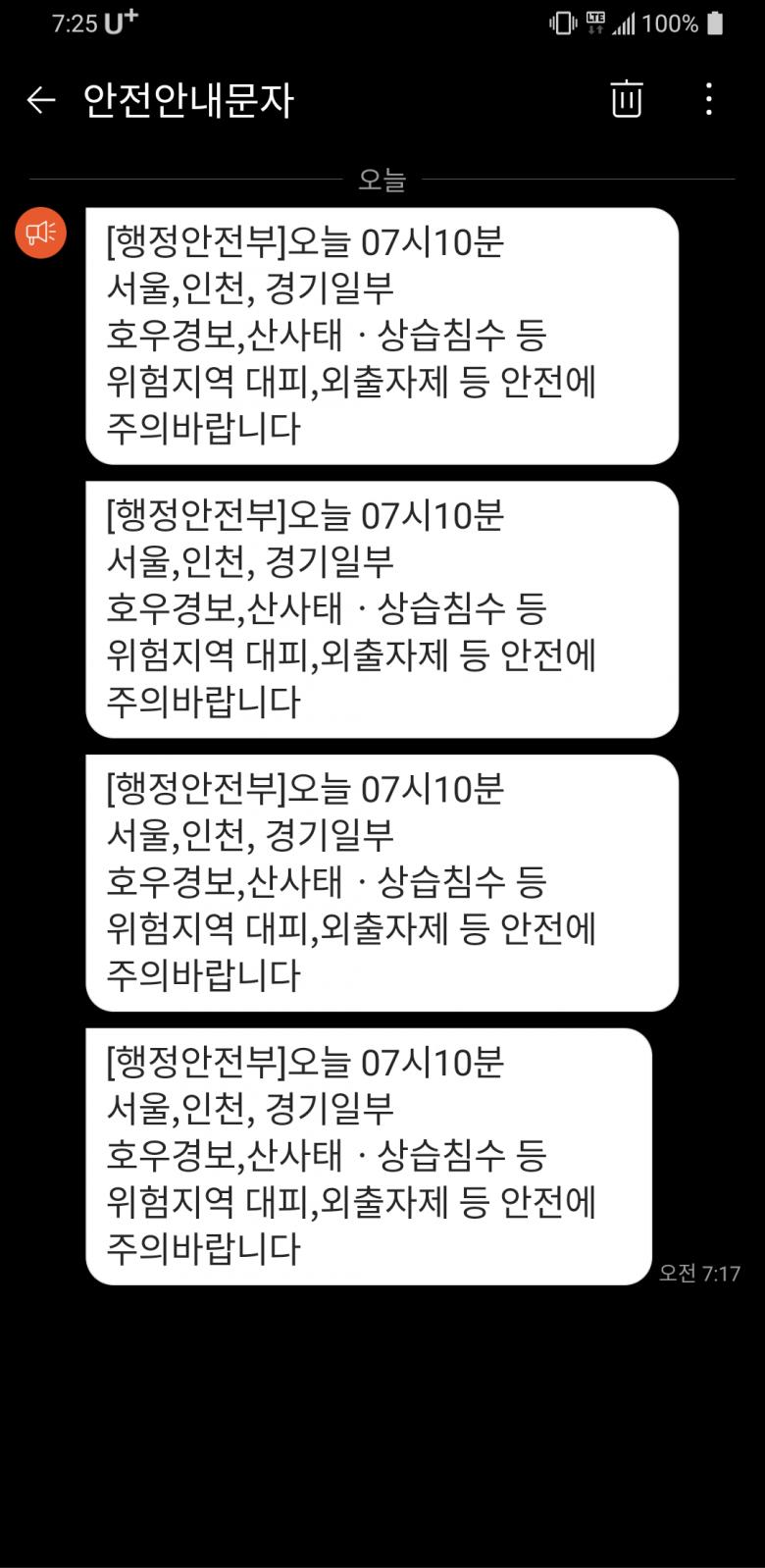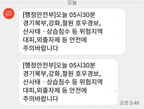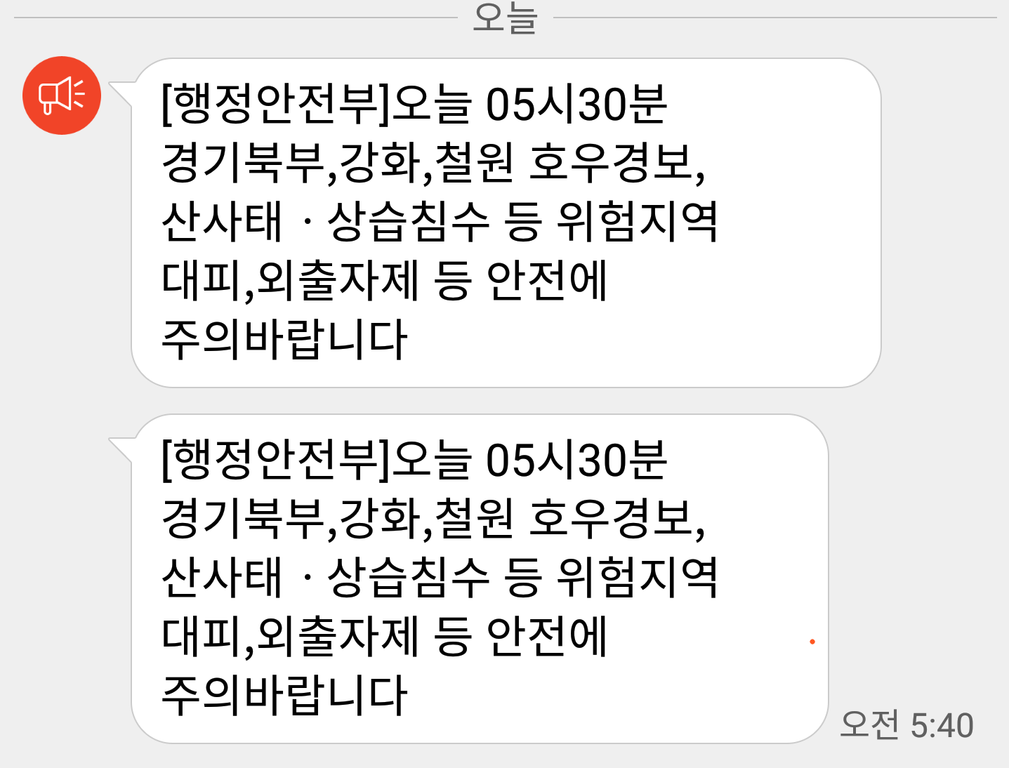 저도 받았네요..그동안 안왔던 비가 한꺼번에 오는건지..너무 많이와도 걱정 안와도 걱정이네요.