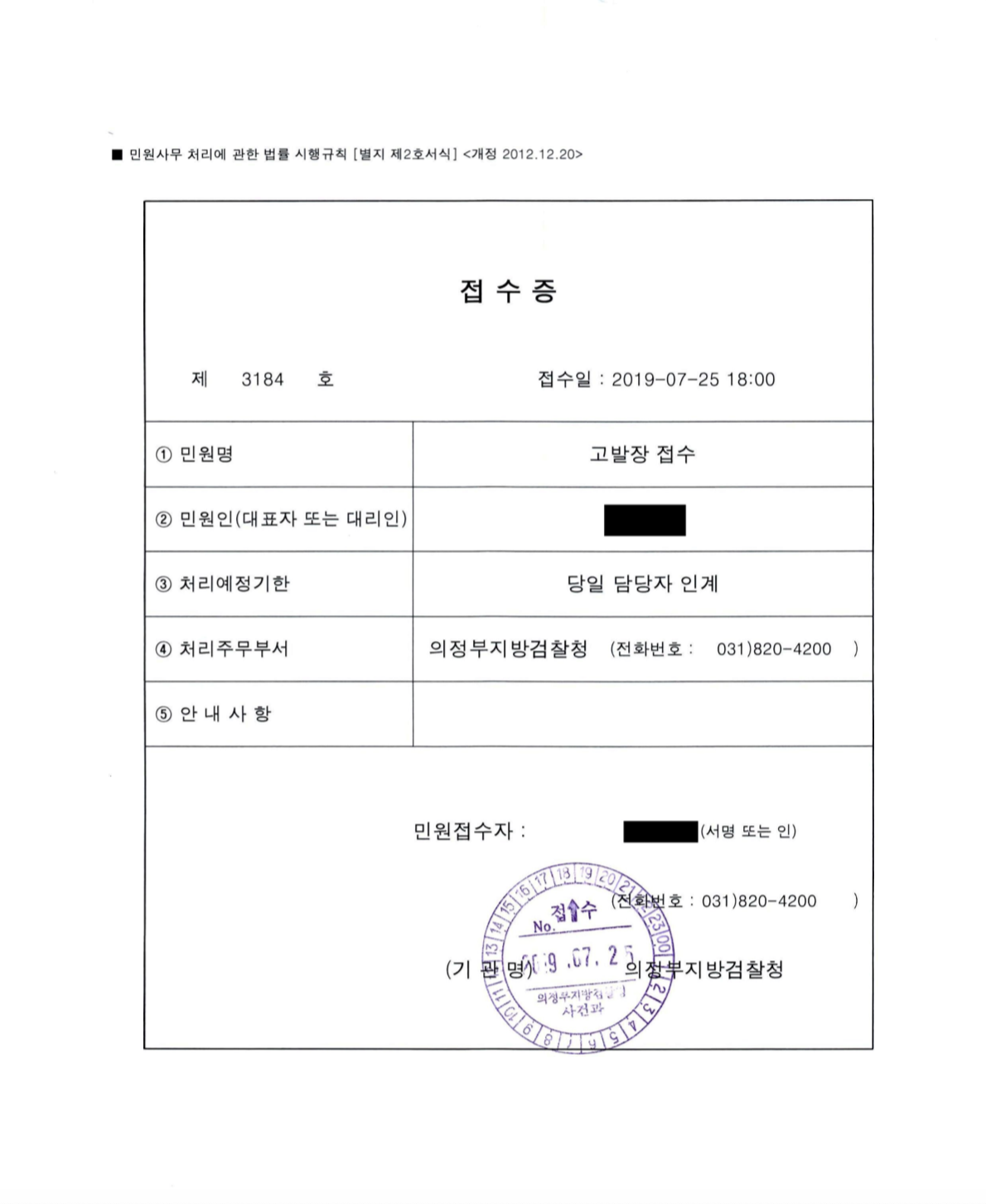 7월 25일 의정부지방검찰청에 고발장 정식으로 접수하였습니다 (인증샷 포함)