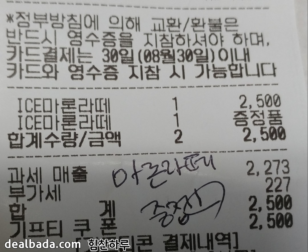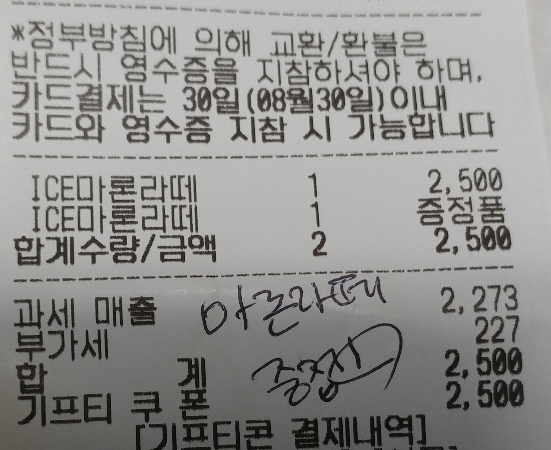 근데 아쉽게도 하나밖에 없어서 다음에 다시 준다고 해서 영수증에 이렇게 표시까지 해줬네요~ㅎㅎ
