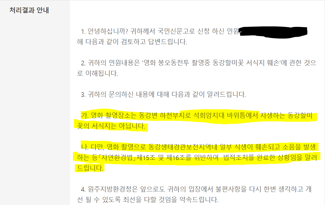대처가 아쉽긴 한데, 할미꽃에 대한 내용을 공식적으로 대응하기엔, 환경파괴 이슈로 커질까 봐 조심스러웠을 거 같기도 해요. |