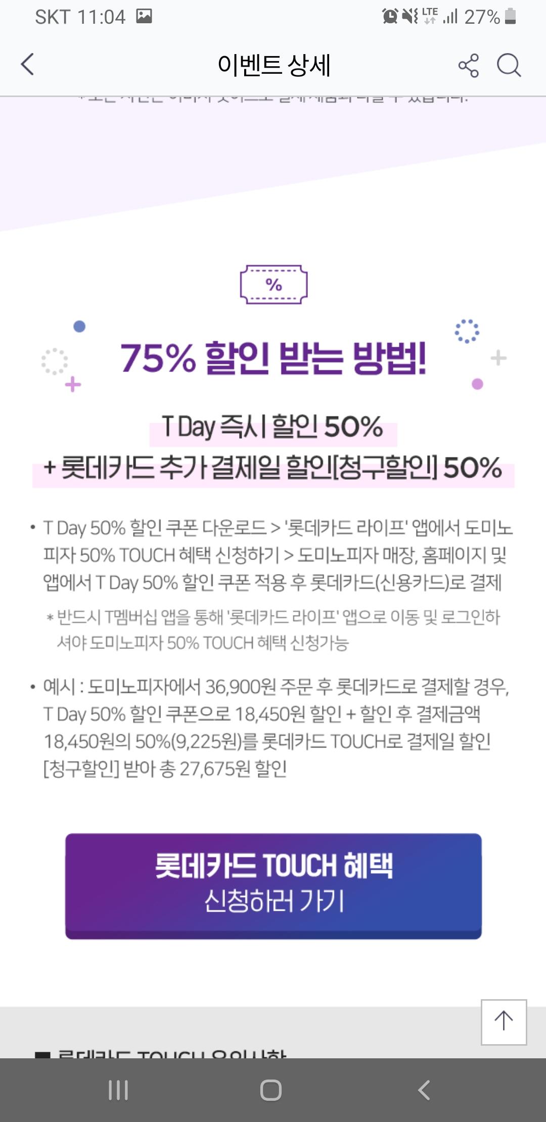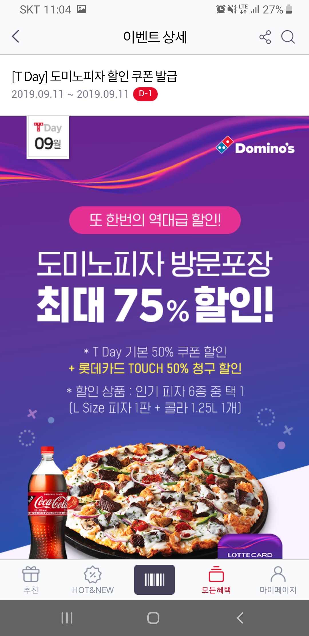 SKT T Day 도미노 50% 롯데카드터치 추가 50%