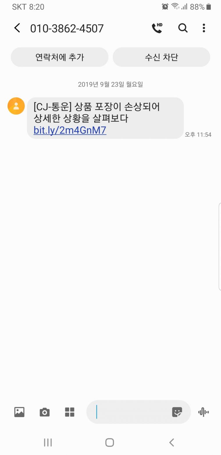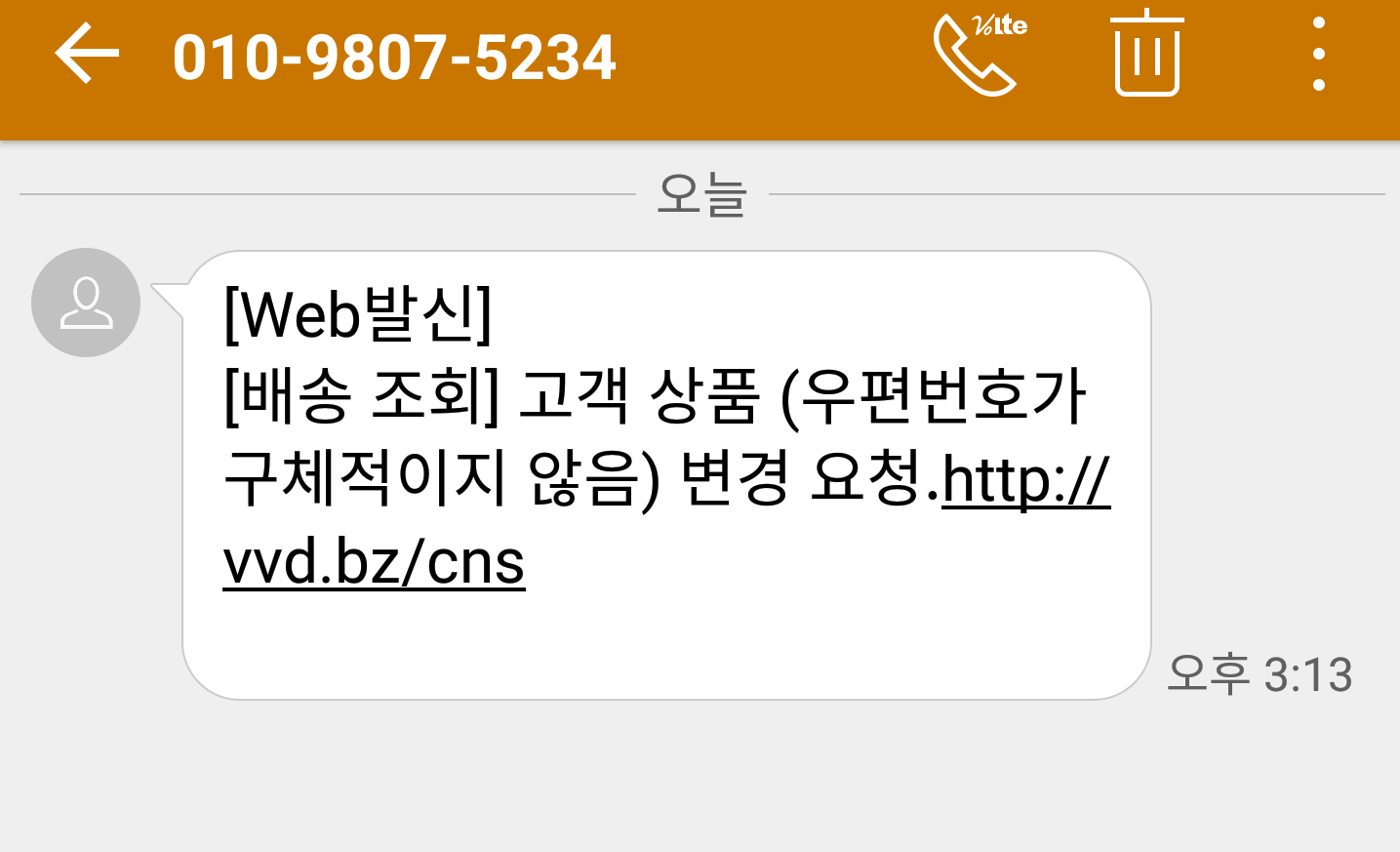 보통 평소에 저렇게 간단하게 택배문자가 오지도 않고 게다가 한번도 우편번호가 잘못되었다는 문자 받아본적이 없어서 받자 마자 의심이 들더군요