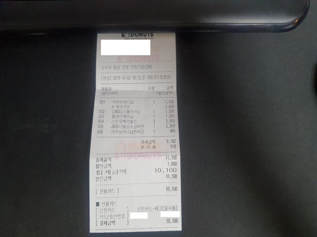 해피포인트 도너츠6개 구매시 천원 할인 쿠폰과 신한 마이샵 더하기로 만원이상 결재시 5천원 할인때문에
