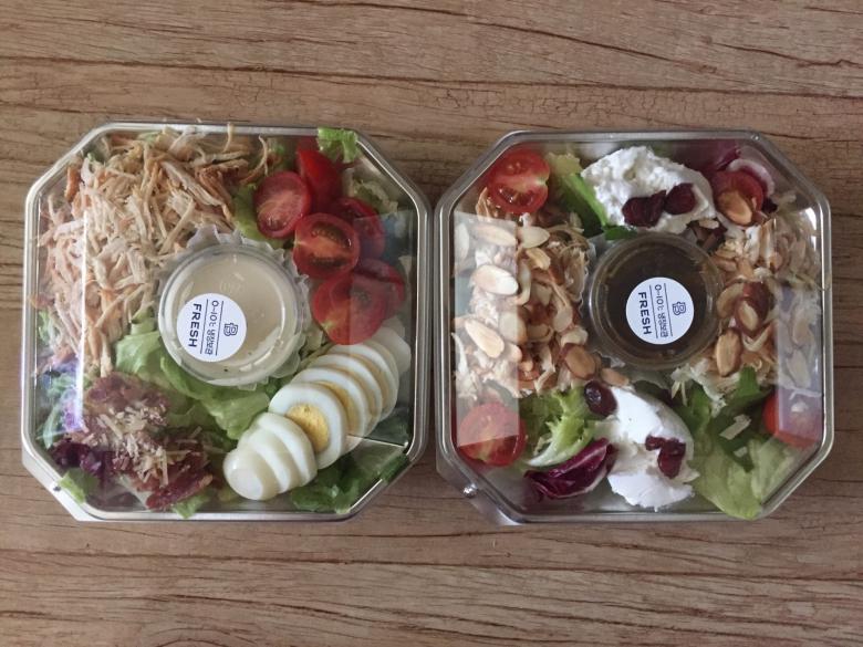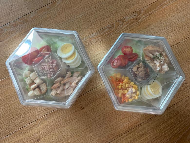좌 오리지널시저샐러드, 우 리코타치즈 치킨샐러드 입니다