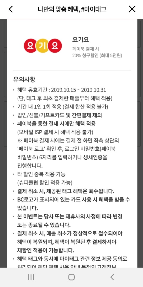 오늘 요기요 결제 하시는 분은 괜찮네요.ㅋ(꼭 신용카드결제하기에서 비씨카드 선택 후 페이북 결제 하셔야 합니다.)
