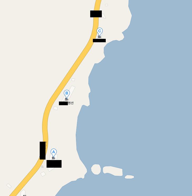 도로와 바다 사이에 있는 펜션을 뜻합니다.
