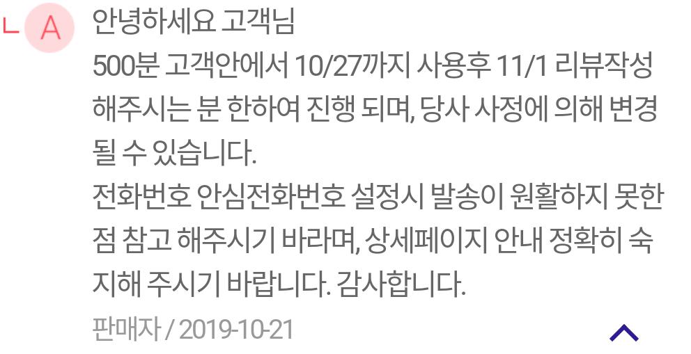 오프셜 : 500분 고객안에서 10/27까지 리뷰 작성하신분에 한하여 11/1 문자로 MMS로 전송됩니다. 당사 사정에 의해 변경 될 수 있습니다. 판매자 답변 달렸네요..