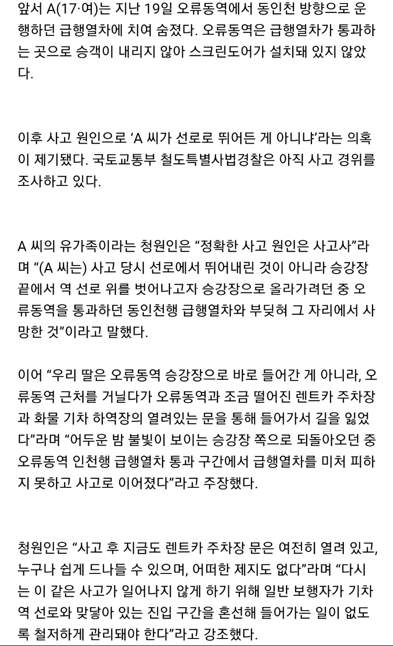 급행구역에서 선로에서 치여서 사망한 사건인데 사고라고 나오고 조사에 들어간걸로 알았는데 그게 자살이라고 잘못된 사실이 퍼져서 고인을 비난하던 사건이 있었더균요...