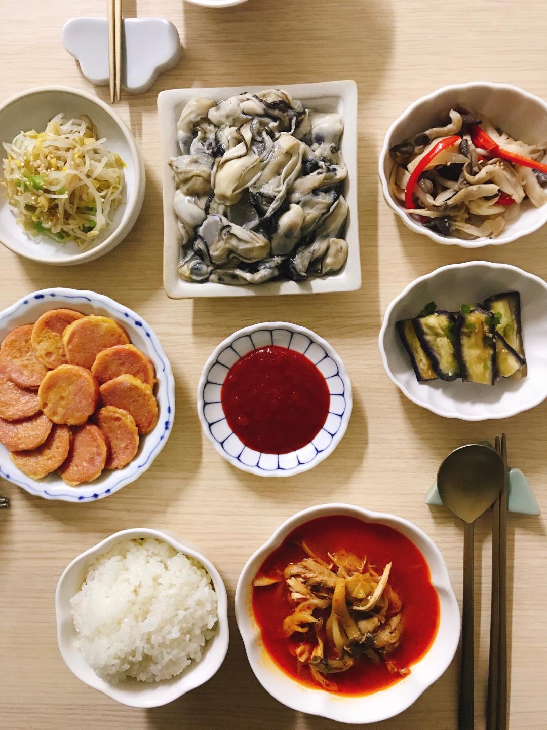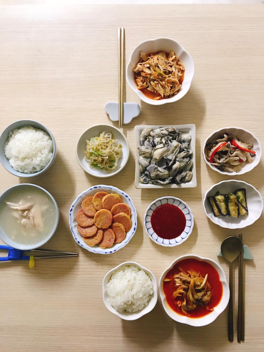 진짜 퍼펙트한 차림이에요. 네이버에서 인기 얻으시면 유투브까지 진출하셨음 좋겠어요! 닭개장에 반찬들까지.. 햄조차도 꽃같고 넘 예뻐요! |