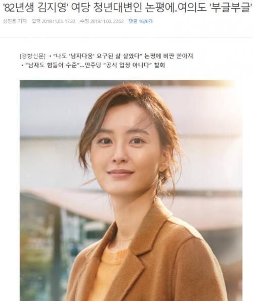 저런걸 '논란'거리로 만드네요...김지영에 공감하는 의견도 이런 의견도 각자 생각할만한건데 꼭 대립각을 만들어 각자이익을 보려는 정치권과 언론들.. | ||